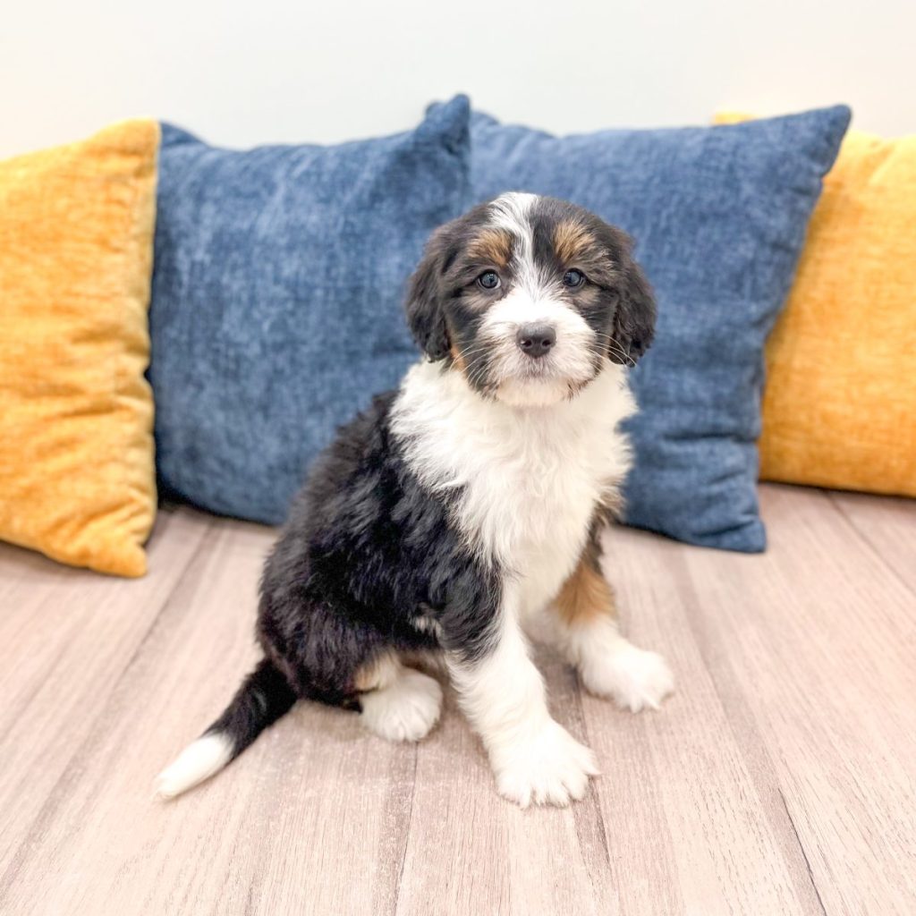 She’s the kind of puppy who loves being close, whether she’s tucked into your arms or resting at your feet while she watches the world with that sweet, steady gaze. Birdie is already showing the classic Bernedoodle blend of intelligence and tenderness, making her an easy companion to bond with and a joy to guide as she grows.