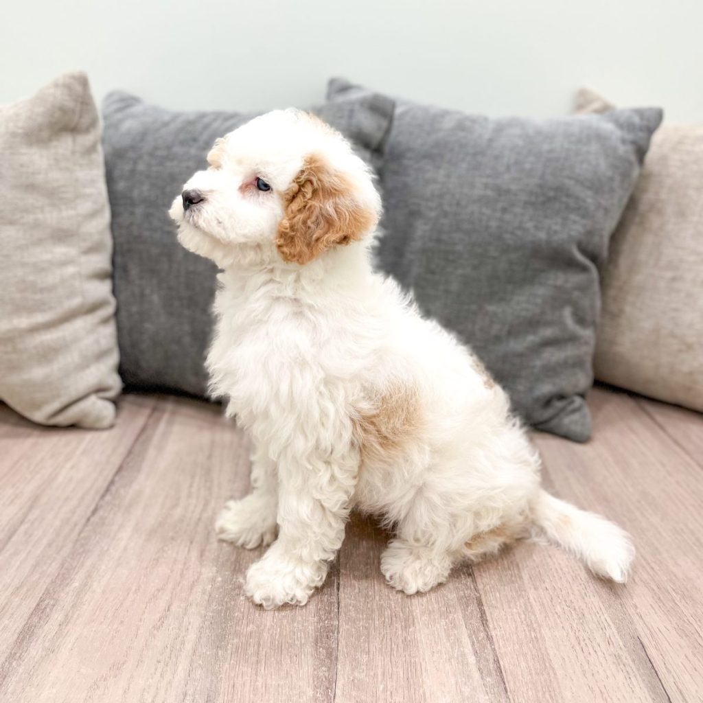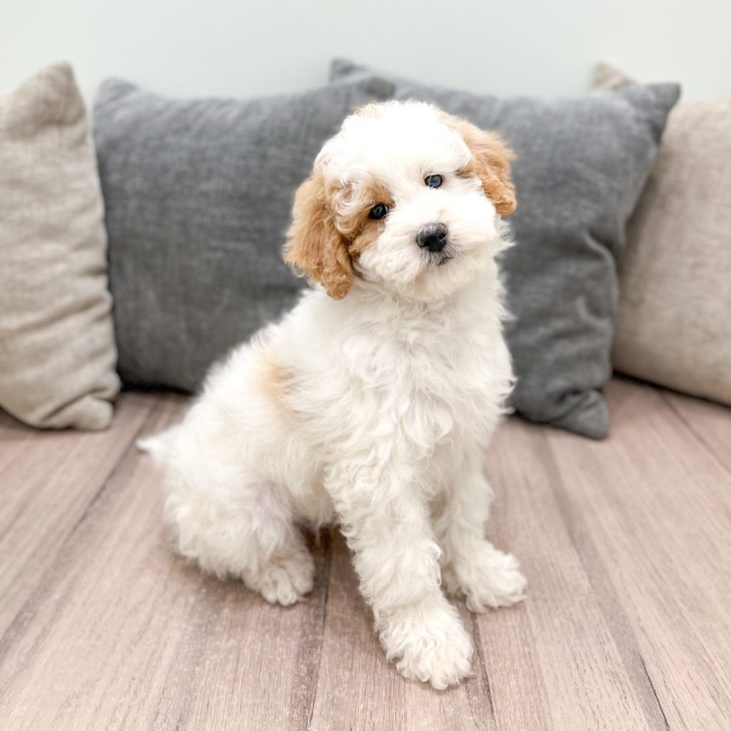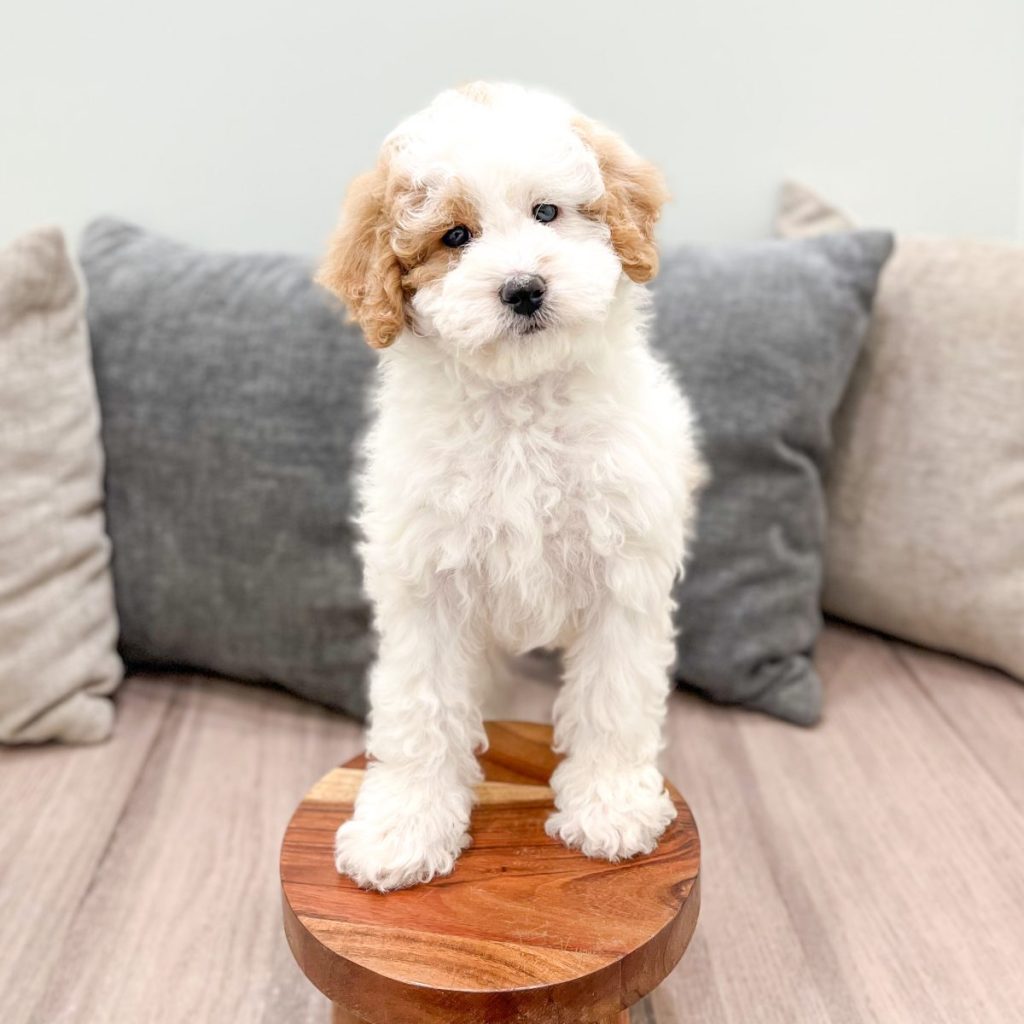Meet Twinkle! This little F1B mini Bernedoodle is a soft swirl of white and warm tan, looking every bit like a living plush toy with a heart full of sweetness. Their coat is already showing that signature F1B fluff—light, wavy, and irresistibly touchable—while the tan markings add a gentle, expressive charm that makes their face and features pop.